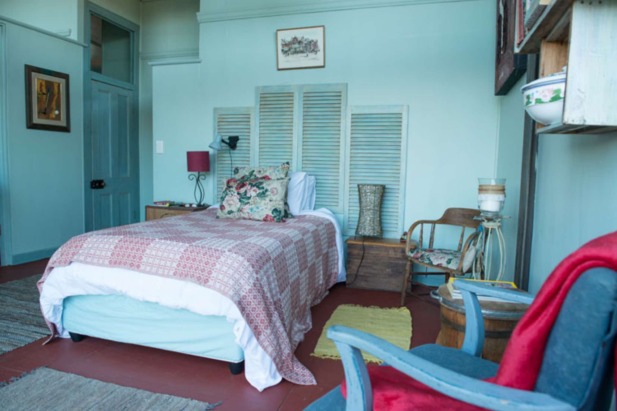 The Retro Room with splashes of colours, and the coolest bathroom overlooking the dam with mountain views. The room is north facing.